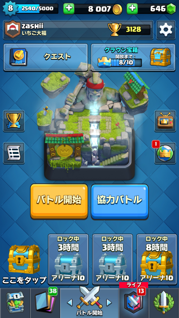 2018-06-08 「クラッシュロワイヤル」ゲームやりました(3128トロフィー) Game まだ無課金だけど、工夫すればもうちょっと上にいけそうです。 インフェルノドラゴンをGETできたのが凄い嬉しい。 破壊力あるゴーレムへの守備はもちろん、城攻めでも一気に落とせるだけの攻撃力があるので大活躍中です。